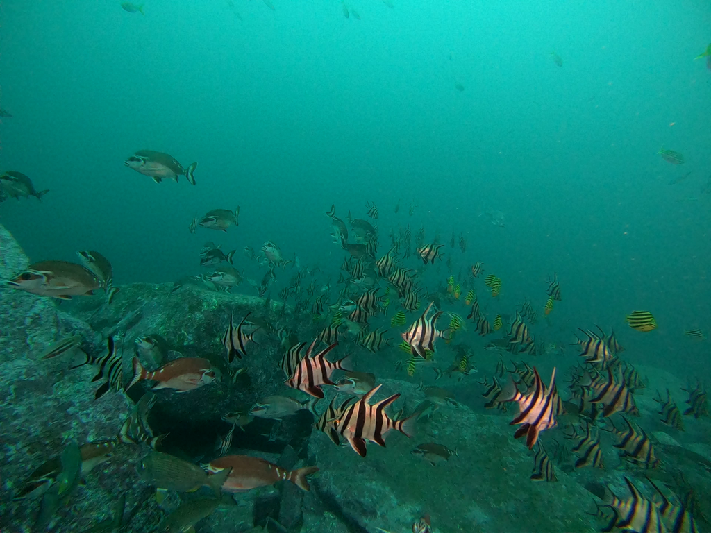 A large mixed species school of fishes in the upper mesophotic zone in the Hunter Marine Park, 50m. Including red morwong Morwong fuscus, old wives Enoplosus armatus, yellow fin bream Acanthopagrus australis, stripy Microcanthus strigatus, mado Atypichthys strigatus.