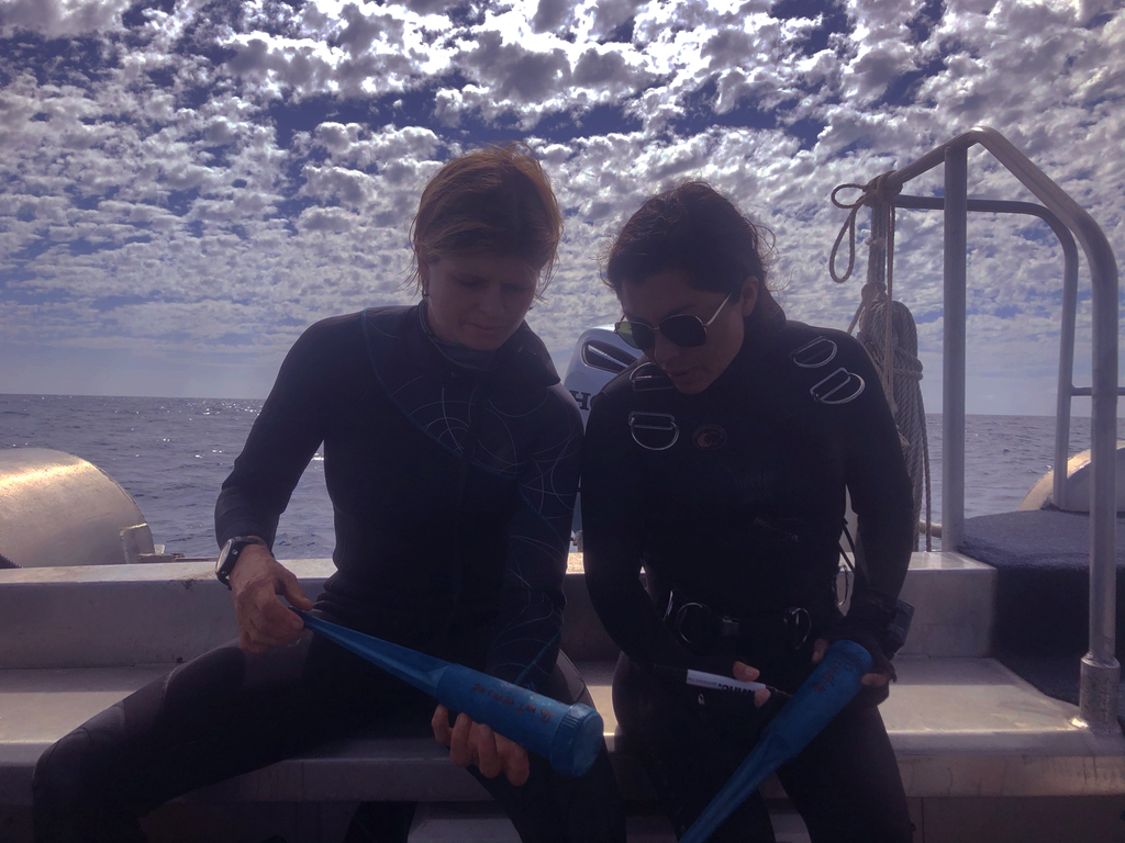 Gemma Galbraith (left) and Erika Gress (right) getting currents meters ready