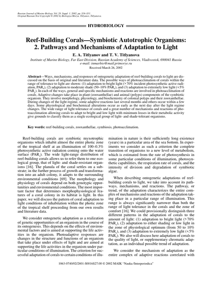 Ways, mechanisms, and responses of ontogenetic adaptation of reef-building corals to light are discussed on the basis of original and literature data. The possible ways of photoacclimation of corals within the range of tolerance to light are shown: (1) adaptation to bright light (>70% incident photosynthetic active radiation, PARs), (2) adaptation to moderate shade (50–10% PARs), and (3) adaptation to extremely low light (<5% PARs). In each of the ways, general and specific mechanisms and reactions are involved in photoacclimation of corals. Adaptive changes take place in plant (zooxanthellae) and animal (polyps) components of the symbiotic organism. They involve morphology, physiology, and biochemistry of colonial polyps and their zooxanthellae. During changes of the light regime, some adaptive reactions last several months and others occur within a few days. Some physiological and biochemical alterations occur as early as the next day after the light regime changes. The wide range of light tolerance of corals and a great number of mechanisms and reactions of photoacclimation allowing corals to adapt to bright and low light with minimum losses in their metabolic activity give grounds to classify them as a single ecological group of light- and shade-tolerant organisms.