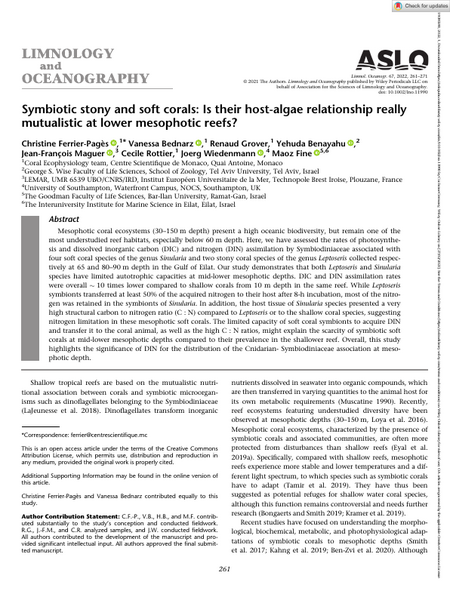 Mesophotic coral ecosystems (30–150 m depth) present a high oceanic biodiversity, but remain one of the most understudied reef habitats, especially below 60 m depth. Here, we have assessed the rates of photosynthesis and dissolved inorganic carbon (DIC) and nitrogen (DIN) assimilation by Symbiodiniaceae associated with four soft coral species of the genus Sinularia and two stony coral species of the genus Leptoseris collected respectively at 65 and 80–90 m depth in the Gulf of Eilat. Our study demonstrates that both Leptoseris and Sinularia species have limited autotrophic capacities at mid-lower mesophotic depths. DIC and DIN assimilation rates were overall ~ 10 times lower compared to shallow corals from 10 m depth in the same reef. While Leptoseris symbionts transferred at least 50% of the acquired nitrogen to their host after 8-h incubation, most of the nitrogen was retained in the symbionts of Sinularia. In addition, the host tissue of Sinularia species presented a very high structural carbon to nitrogen ratio (C : N) compared to Leptoseris or to the shallow coral species, suggesting nitrogen limitation in these mesophotic soft corals. The limited capacity of soft coral symbionts to acquire DIN and transfer it to the coral animal, as well as the high C : N ratios, might explain the scarcity of symbiotic soft corals at mid-lower mesophotic depths compared to their prevalence in the shallower reef. Overall, this study highlights the significance of DIN for the distribution of the Cnidarian- Symbiodiniaceae association at mesophotic depth.