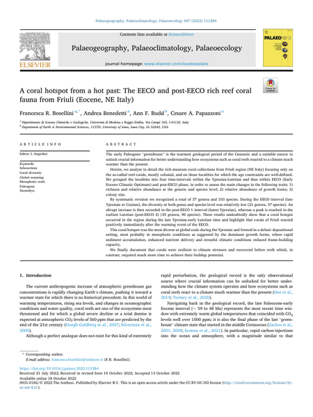 The early Paleogene “greenhouse” is the warmest geological period of the Cenozoic and a suitable source to unlock crucial information for better understanding how ecosystems such as coral reefs reacted to a climate much warmer than the present. Herein, we analyse in detail the rich museum coral collections from Friuli region (NE Italy) focusing only on the so-called reef corals, mostly colonial, and on those localities for which the age constraints are well-defined. We grouped the localities into four time-intervals within the Ypresian-Lutetian and thus within EECO (Early Eocene Climatic Optimum) and post-EECO phase, in order to assess the main changes in the following traits: 1) richness and relative abundance at the generic and species level; 2) relative abundance of growth forms; 3) colony size. By systematic revision we recognized a total of 37 genera and 103 species. During the EECO interval (late Ypresian or Cuisian), the diversity at both genus and species level was relatively low (21 genera, 37 species). An abrupt increase is then recorded in the post-EECO 1 interval (latest Ypresian), whereas a peak is reached in the earliest Lutetian (post-EECO 2) (35 genera, 90 species). These results undoubtedly show that a coral hotspot occurred in the region during the late Ypresian-early Lutetian time and highlight that corals of Friuli reacted positively immediately after the warming event of the EECO. This coral hotspot was the most diverse at global scale during the Ypresian and formed in a deltaic depositional setting, most probably in mesophotic conditions as suggested by the dominant growth forms, where rapid sediment accumulation, enhanced nutrient delivery and stressful climatic conditions reduced frame-building capacity. We finally document that corals were resilient to climate stressors and recovered before reefs which, in contrast, required much more time to achieve their buildup potential.