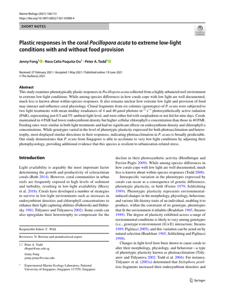 This study examines phenotypically plastic responses in Pocillopora acuta collected from a highly urbanized reef environment to extreme low-light conditions. While among-species differences in how corals cope with low light are well documented, much less is known about within-species responses. It also remains unclear how extreme low light and provision of food may interact and influence coral physiology. Clonal fragments from six colonies (genotypes) of P. acuta were subjected to two light treatments with mean midday irradiances of 4 and 40 μmol photons m−2 s−1 photosynthetically active radiation (PAR), representing just 0.5 and 5% ambient light level, and were either fed with zooplankton or not fed for nine days. Corals maintained in 4 PAR had lower endosymbiont density but higher cellular chlorophyll a concentration than those in 40 PAR. Feeding rates were similar in both light treatments and had no significant effects on endosymbiont density and chlorophyll a concentrations. While genotypes varied in the level of phenotypic plasticity expressed for both photoacclimation and heterotrophy, most displayed similar directions in their responses, indicating photoacclimation in P. acuta is broadly predictable. Our study demonstrates that P. acuta from Singapore is able to acclimate to very low-light conditions by adjusting their photophysiology, providing additional evidence that this species is resilient to urbanization-related stress.