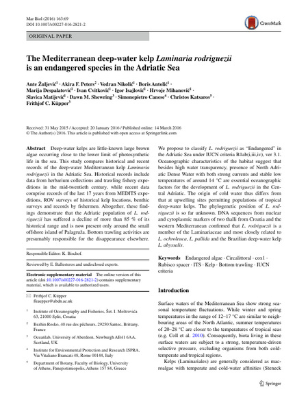 Deep-water kelps are little-known large brown algae occurring close to the lower limit of photosynthetic life in the sea. This study compares historical and recent records of the deep-water Mediterranean kelp Laminaria rodriguezii in the Adriatic Sea. Historical records include data from herbarium collections and trawling fishery expeditions in the mid-twentieth century, while recent data comprise records of the last 17 years from MEDITS expeditions, ROV surveys of historical kelp locations, benthic surveys and records by fishermen. Altogether, these findings demonstrate that the Adriatic population of L. rodriguezii has suffered a decline of more than 85 % of its historical range and is now present only around the small offshore island of Palagruža. Bottom trawling activities are presumably responsible for the disappearance elsewhere. We propose to classify L. rodriguezii as “Endangered” in the Adriatic Sea under IUCN criteria B1ab(i,iii,iv), ver 3.1. Oceanographic characteristics of the habitat suggest that besides high water transparency, presence of North Adriatic Dense Water with both strong currents and stable low temperatures of around 14 °C are essential oceanographic factors for the development of L. rodriguezii in the Central Adriatic. The origin of cold water thus differs from that at upwelling sites permitting populations of tropical deep-water kelps. The phylogenetic position of L. rodriguezii is so far unknown. DNA sequences from nuclear and cytoplasmic markers of two thalli from Croatia and the western Mediterranean confirmed that L. rodriguezii is a member of the Laminariaceae and most closely related to L. ochroleuca, L. pallida and the Brazilian deep-water kelp L. abyssalis.