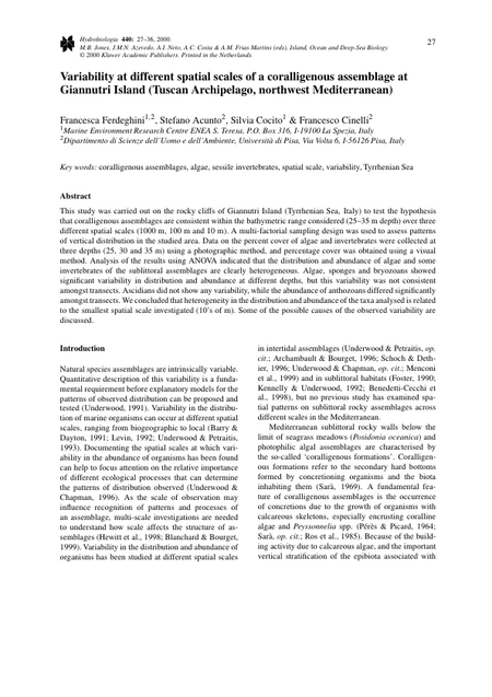 This study was carried out on the rocky cliffs of Giannutri Island (Tyrrhenian Sea, Italy) to test the hypothesis that coralligenous assemblages are consistent within the bathymetric range considered (25–35 m depth) over three different spatial scales (1000 m, 100 m and 10 m). A multi-factorial sampling design was used to assess patterns of vertical distribution in the studied area. Data on the percent cover of algae and invertebrates were collected at three depths (25, 30 and 35 m) using a photographic method, and percentage cover was obtained using a visual method. Analysis of the results using ANOVA indicated that the distribution and abundance of algae and some invertebrates of the sublittoral assemblages are clearly heterogeneous. Algae, sponges and bryozoans showed significant variability in distribution and abundance at different depths, but this variability was not consistent amongst transects. Ascidians did not show any variability, while the abundance of anthozoans differed significantly amongst transects. We concluded that heterogeneity in the distribution and abundance of the taxa analysed is related to the smallest spatial scale investigated (10's of m). Some of the possible causes of the observed variability are discussed.