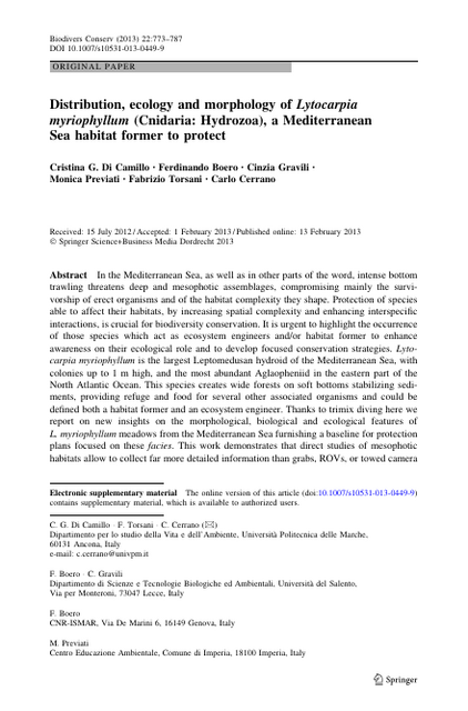 In the Mediterranean Sea, as well as in other parts of the word, intense bottom trawling threatens deep and mesophotic assemblages, compromising mainly the survi- vorship of erect organisms and of the habitat complexity they shape. Protection of species able to affect their habitats, by increasing spatial complexity and enhancing interspecific interactions, is crucial for biodiversity conservation. It is urgent to highlight the occurrence of those species which act as ecosystem engineers and/or habitat former to enhance awareness on their ecological role and to develop focused conservation strategies. Lyto- carpia myriophyllum is the largest Leptomedusan hydroid of the Mediterranean Sea, with colonies up to 1 m high, and the most abundant Aglaopheniid in the eastern part of the North Atlantic Ocean. This species creates wide forests on soft bottoms stabilizing sedi- ments, providing refuge and food for several other associated organisms and could be defined both a habitat former and an ecosystem engineer. Thanks to trimix diving here we report on new insights on the morphological, biological and ecological features of L. myriophyllum meadows from the Mediterranean Sea furnishing a baseline for protection plans focused on these facies. This work demonstrates that direct studies of mesophotic habitats allow to collect far more detailed information than grabs, ROVs, or towed camera arrays and highlights the urgent need to redefine the vertical extension of several marine protected areas.