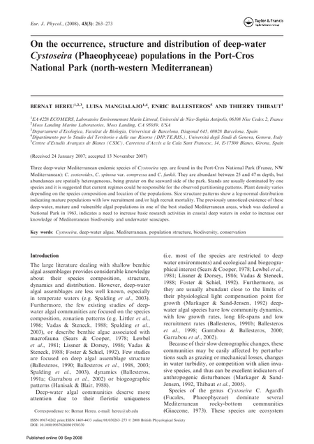 Three deep-water Mediterranean endemic species of Cystoseira spp. are found in the Port-Cros National Park (France, NW Mediterranean): C. zosteroides, C. spinosa var. compressa and C. funkii. They are abundant between 25 and 47m depth, but abundances are spatially heterogeneous, being greater on the seaward side of the park. Stands are usually dominated by one species and it is suggested that current regimes could be responsible for the observed partitioning patterns. Plant density varies depending on the species composition and location of the populations. Size structure patterns show a log-normal distribution indicating mature populations with low recruitment and/or high recruit mortality. The previously unnoticed existence of these deep-water, mature and vulnerable algal populations in one of the best studied Mediterranean areas, which was declared a National Park in 1963, indicates a need to increase basic research activities in coastal deep waters in order to increase our knowledge of Mediterranean biodiversity and underwater seascapes.
