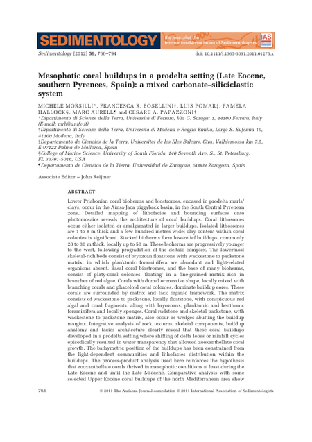 Lower Priabonian coral bioherms and biostromes, encased in prodelta marls/clays, occur in the Aínsa-Jaca piggyback basin, in the South Central Pyrenean zone. Detailed mapping of lithofacies and bounding surfaces onto photomosaics reveals the architecture of coral buildups. Coral lithosomes occur either isolated or amalgamated in larger buildups. Isolated lithosomes are 1 to 8 m thick and a few hundred metres wide; clay content within coral colonies is significant. Stacked bioherms form low-relief buildups, commonly 20 to 30 m thick, locally up to 50 m. These bioherms are progressively younger to the west, following progradation of the deltaic complex. The lowermost skeletal-rich beds consist of bryozoan floatstone with wackestone to packstone matrix, in which planktonic foraminifera are abundant and light-related organisms absent. Basal coral biostromes, and the base of many bioherms, consist of platy-coral colonies ‘floating’ in a fine-grained matrix rich in branches of red algae. Corals with domal or massive shape, locally mixed with branching corals and phaceloid coral colonies, dominate buildup cores. These corals are surrounded by matrix and lack organic framework. The matrix consists of wackestone to packstone, locally floatstone, with conspicuous red algal and coral fragments, along with bryozoans, planktonic and benthonic foraminifera and locally sponges. Coral rudstone and skeletal packstone, with wackestone to packstone matrix, also occur as wedges abutting the buildup margins. Integrative analysis of rock textures, skeletal components, buildup anatomy and facies architecture clearly reveal that these coral buildups developed in a prodelta setting where shifting of delta lobes or rainfall cycles episodically resulted in water transparency that allowed zooxanthellate coral growth. The bathymetric position of the buildups has been constrained from the light-dependent communities and lithofacies distribution within the buildups. The process-product analysis used here reinforces the hypothesis that zooxanthellate corals thrived in mesophotic conditions at least during the Late Eocene and until the Late Miocene. Comparative analysis with some selected Upper Eocene coral buildups of the north Mediterranean area show similarities in facies, components and textures, and suggest that they also grew in relatively low light (mesophotic) and low hydrodynamic conditions.