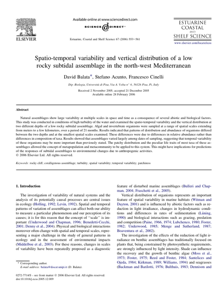 Natural assemblages show large variability at multiple scales in space and time as a consequence of several abiotic and biological factors. This study was conducted in conditions of high turbidity of the water and examined the spatio-temporal variability and the vertical distribution at two different depths of a low rocky subtidal assemblage. Algal and invertebrate organisms were sampled at a range of spatial scales extending from meters to a few kilometers, over a period of 21 months. Results indicated that patterns of distribution and abundance of organisms differed between the two depths and at the smallest spatial scales examined. These differences were due to differences in relative abundance rather than differences in composition of taxa. Results showed that assemblages varied largely among dates of sampling, suggesting that temporal variability of these organisms may be more important than previously stated. The patchy distribution and the peculiar life traits of most taxa of these assemblages allowed the concept of metapopulation and metacommunity to be applied to this system. This might have implications for predictions of the responses of subtidal assemblages to environmental changes due to anthropogenic activities.