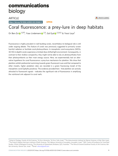 Fluorescence is highly prevalent in reef-building corals, nevertheless its biological role is still under ongoing debate. This feature of corals was previously suggested to primarily screen harmful radiation or facilitate coral photosynthesis. In mesophotic coral ecosystems (MCEs; 30-150 m depth) corals experience a limited, blue-shifted light environment. Consequently, in contrast to their shallow conspecifics, they might not be able to rely on photosynthates from their photosymbionts as their main energy source. Here, we experimentally test an alternative hypothesis for coral fluorescence: a prey-lure mechanism for plankton. We show that plankton exhibit preferential swimming towards green fluorescent cues and that compared to other morphs, higher predation rates are recorded in a green fluorescing morph of the mesophotic coral Euphyllia paradivisa. The evidence provided here - that plankton are actively attracted to fluorescent signals - indicates the significant role of fluorescence in amplifying the nutritional sink adjacent to coral reefs.