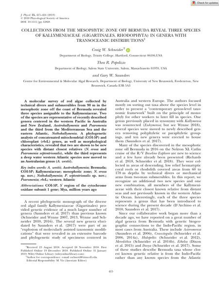 A molecular survey of red algae collected by technical divers and submersibles from 90 m in the mesophotic zone off the coast of Bermuda revealed three species assignable to the Kallymeniaceae. Two of the species are representative of recently described genera centered in the western Pacific in Australia and New Zealand, Austrokallymenia and Psaromenia and the third from the Mediterranean Sea and the eastern Atlantic, Nothokallymenia. A phylogenetic analysis of concatenated mitochondrial (COI-5P) and chloroplast (rbcL) genes, as well as morphological characteristics, revealed that two are shown to be new species with distant closest relatives (N. erosa and Psaromenia septentrionalis), while the third represents a deep water western Atlantic species now moved to an Australasian genus (A. westii).