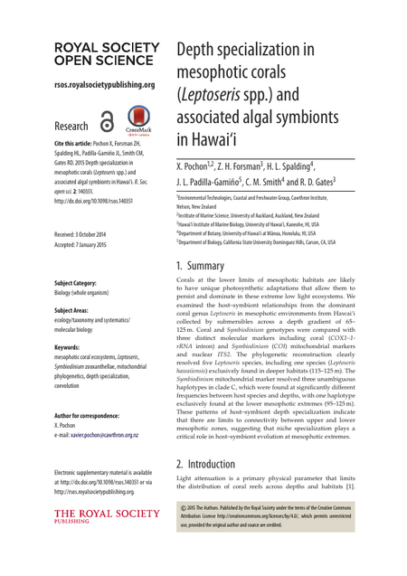 Corals at the lower limits of mesophotic habitats are likely to have unique photosynthetic adaptations that allow them to persist and dominate in these extreme low light ecosystems. We examined the host–symbiont relationships from the dominant coral genus Leptoseris in mesophotic environments from Hawai‘i collected by submersibles across a depth gradient of 65–125 m. Coral and Symbiodinium genotypes were compared with three distinct molecular markers including coral (COX1–1-rRNA intron) and Symbiodinium (COI) mitochondrial markers and nuclear ITS2. The phylogenetic reconstruction clearly resolved five Leptoseris species, including one species (Leptoseris hawaiiensis) exclusively found in deeper habitats (115–125 m). The Symbiodinium mitochondrial marker resolved three unambiguous haplotypes in clade C, which were found at significantly different frequencies between host species and depths, with one haplotype exclusively found at the lower mesophotic extremes (95–125 m). These patterns of host–symbiont depth specialization indicate that there are limits to connectivity between upper and lower mesophotic zones, suggesting that niche specialization plays a critical role in host–symbiont evolution at mesophotic extremes.