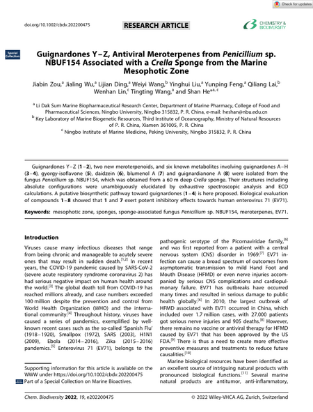 Guignardones Y-Z (1-2), two new meroterpenoids, and six known metabolites involving guignardones A-H (3-4), gyorgy-isoflavone (5), daidzein (6), blumenol A (7) and guignardianone A (8) were isolated from the fungus Penicillium sp. NBUF154, which was obtained from a 60 m deep Crella sponge. Their structures including absolute configurations were unambiguously elucidated by exhaustive spectroscopic analysis and ECD calculations. A putative biosynthetic pathway toward guignardones (1-4) is here proposed. Biological evaluation of compounds 1-8 showed that 1 and 7 exert potent inhibitory effects towards human enterovirus 71 (EV71).