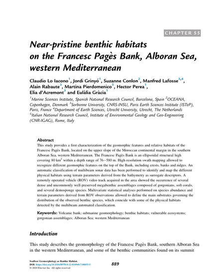 This study provides a first characterization of the geomorphic features and relative habitats of the Francesc Pagès Bank, located on the upper slope of the Moroccan continental margin in the southern Alboran Sea, western Mediterranean. The Francesc Pagès Bank is an ellipsoidal structural high covering 80 km2 within a depth range of 76–580 m. High-resolution swath mapping allowed to recognize different geomorphic features on the top of the Bank, including crests, banks and ridges. An automatic classification of multibeam sonar data has been performed to identify and map the different physical habitats using terrain parameters derived from the bathymetry as surrogate descriptors. A remotely operated vehicle (ROV) video track acquired in the area showed the occurrence of several dense and uncommonly well-preserved megabenthic assemblages composed of gorgonians, soft corals, and several demosponge species. Multivariate statistical analyses performed on species abundance and terrain parameters derived from ROV observations allowed to define the main substrates governing the distribution of the observed benthic species, which coincide with some of the physical habitats detected by the multibeam automated classification.