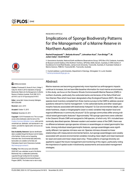 Marine reserves are becoming progressively more important as anthropogenic impacts continue to increase, but we have little baseline information for most marine environments. In this study, we focus on the Oceanic Shoals Commonwealth Marine Reserve (CMR) in northern Australia, particularly the carbonate banks and terraces of the Sahul Shelf and Van Diemen Rise which have been designated a Key Ecological Feature (KEF). We use a species-level inventory compiled from three marine surveys to the CMR to address several questions relevant to marine management: 1) Are carbonate banks and other raised geomorphic features associated with biodiversity hotspots? 2) Can environmental (depth, substrate hardness, slope) or biogeographic (east vs west) variables help explain local and regional differences in community structure? 3) Do sponge communities differ among individual raised geomorphic features? Approximately 750 sponge specimens were collected in the Oceanic Shoals CMR and assigned to 348 species, of which only 18% included taxonomically described species. Between eastern and western areas of the CMR, there was no difference between sponge species richness or assemblages on raised geomorphic features. Among individual raised geomorphic features, sponge assemblages were significantly different, but species richness was not. Species richness showed no linear relationships with measured environmental factors, but sponge assemblages were weakly associated with several environmental variables including mean depth and mean backscatter (east and west) and mean slope (east only). These patterns of sponge diversity are applied to support the future management and monitoring of this region, particularly noting the importance of spatial scale in biodiversity assessments and associated management strategies.