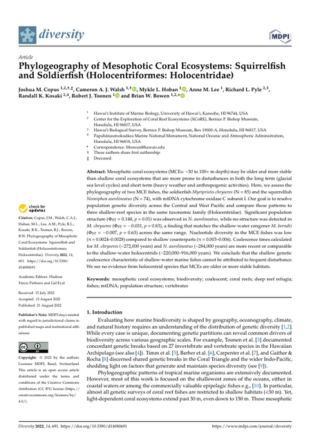 Mesophotic coral ecosystems (MCEs: ~30 to 100+ m depth) may be older and more stable than shallow coral ecosystems that are more prone to disturbances in both the long term (glacial sea level cycles) and short term (heavy weather and anthropogenic activities). Here, we assess the phylogeography of two MCE fishes, the soldierfish Myripristis chryseres (N = 85) and the squirrelfish Neoniphon aurolineatus (N = 74), with mtDNA cytochrome oxidase C subunit I. Our goal is to resolve population genetic diversity across the Central and West Pacific and compare these patterns to three shallow-reef species in the same taxonomic family (Holocentridae). Significant population structure (ΦST = 0.148, p = 0.01) was observed in N. aurolineatus, while no structure was detected in M. chryseres (ΦST = −0.031, p = 0.83), a finding that matches the shallow-water congener M. berndti (ΦST = −0.007, p = 0.63) across the same range. Nucleotide diversity in the MCE fishes was low (π = 0.0024–0.0028) compared to shallow counterparts (π = 0.003–0.006). Coalescence times calculated for M. chryseres (~272,000 years) and N. aurolineatus (~284,000 years) are more recent or comparable to the shallow-water holocentrids (~220,000–916,000 years). We conclude that the shallow genetic coalescence characteristic of shallow-water marine fishes cannot be attributed to frequent disturbance. We see no evidence from holocentrid species that MCEs are older or more stable habitats.