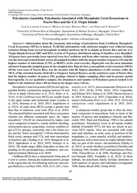 Information about the taxonomy and ecology of polychaetes from Caribbean Mesophotic Coral Ecosystems (MCEs) is limited. To fill this information void, substrata samples were collected using technical diving from several mesophotic localities (between 40–91 m depth) in Puerto Rico and the U.S. Virgin Islands between 2007 and 2012. A total of 76 genera, distributed among 34 families, were identified. All genera have previously been reported from the Caribbean and from other marine ecoregions. Syllidae was the best-represented family across all sampled localities with the largest number of genera (15) and the highest number of individuals (5,755, or 80.85% of the total records). Haplosyllis was the most abundant and most frequently sampled genus in the sampled sites. Bajo de Sico, a mesophotic coral ecosystem (MCE) off the west coast of Puerto Rico, was the location with the highest abundances (1,183 worms), while the MCE of the extended insular shelf off La Parguera Natural Reserve on the southwest coast of Puerto Rico had the highest number of genera (59), perhaps related to higher sampling effort and its greater spatial heterogeneity. In our qualitative samples, the abundances and number of Polychaeta genera tended to be higher in the shallower sites (<60 m) than in the deeper ones (>60 m).