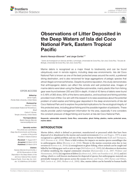 Marine debris is recognized as a major threat to biodiversity and can be found ubiquitously even in remote regions, including deep-sea environments. Isla del Coco National Park is known as one of the best protected areas around the world, a preferred diving destination, and is also renowned for large aggregations of pelagic species that attract illegal commercial fisheries. Despite its pristine reputation, this study demonstrates that anthropogenic debris can affect this remote and well protected area. Images of marine debris were taken using the DeepSee submersible, mainly plastic litter from fishing gear were found between 200 and 350 m depth. A total of 40 items of debris were found in 5.48% of 365 dives, 60% of the items were plastics, and local boat and fishing activities provided most of litter. Our aim with this research is to raise awareness about the potential problem of solid wastes and fishing gear deposited in the deep environments of Isla del Coco National Park and to explore the potential implications for the ecological integrity of this protected area, including ghost fishing and the possible ingestion of pollutants. These results provide useful management information for the area, especially if one considers the constant pressure of illegal fishing and tourism at Isla del Coco National Park.