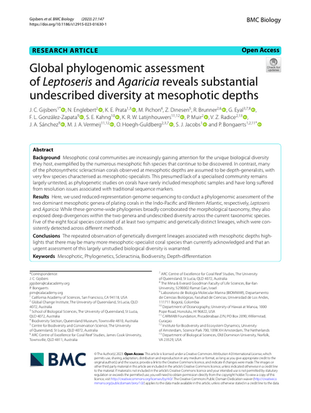 Background Mesophotic coral communities are increasingly gaining attention for the unique biological diversity they host, exemplified by the numerous mesophotic fish species that continue to be discovered. In contrast, many of the photosynthetic scleractinian corals observed at mesophotic depths are assumed to be depth-generalists, with very few species characterised as mesophotic-specialists. This presumed lack of a specialised community remains largely untested, as phylogenetic studies on corals have rarely included mesophotic samples and have long suffered from resolution issues associated with traditional sequence markers. Results Here, we used reduced-representation genome sequencing to conduct a phylogenomic assessment of the two dominant mesophotic genera of plating corals in the Indo-Pacific and Western Atlantic, respectively, Leptoseris and Agaricia. While these genome-wide phylogenies broadly corroborated the morphological taxonomy, they also exposed deep divergences within the two genera and undescribed diversity across the current taxonomic species. Five of the eight focal species consisted of at least two sympatric and genetically distinct lineages, which were con‑ sistently detected across different methods. Conclusions The repeated observation of genetically divergent lineages associated with mesophotic depths high‑ lights that there may be many more mesophotic-specialist coral species than currently acknowledged and that an urgent assessment of this largely unstudied biological diversity is warranted.