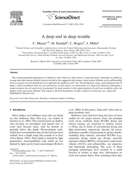 The well-documented degradation of shallower reefs which are often closer to land and more vulnerable to pollution, sewage and other human-related stressors has led to the suggestion that deeper, more remote offshore reefs could possibly serve as sources of coral and fish larvae to replenish the shallower reefs. Yet, the distribution, status, and ecological roles of deep (>30 m) Caribbean reefs are not well known. In this report, an observation of a deep reef which has undergone a recent extensive loss of coral cover is presented. In stark contrast to the typical pattern of coral loss in shallow reefs, the deeper corals were most affected. This report is the first description of such a pattern of coral loss on a deep reef.