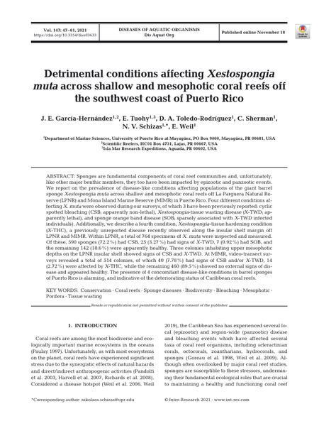 Sponges are fundamental components of coral reef communities and, unfortunately, like other major benthic members, they too have been impacted by epizootic and panzootic events. We report on the prevalence of disease-like conditions affecting populations of the giant barrel sponge Xestospongia muta across shallow and mesophotic coral reefs off La Parguera Natural Reserve (LPNR) and Mona Island Marine Reserve (MIMR) in Puerto Rico. Four different conditions affecting X. muta were observed during our surveys, of which 3 have been previously reported: cyclic spotted bleaching (CSB; apparently non-lethal), Xestospongia-tissue wasting disease (X-TWD; apparently lethal), and sponge orange band disease (SOB; sparsely associated with X-TWD infected individuals). Additionally, we describe a fourth condition, Xestospongia-tissue hardening condition (X-THC), a previously unreported disease recently observed along the insular shelf margin off LPNR and MIMR. Within LPNR, a total of 764 specimens of X. muta were inspected and measured. Of these, 590 sponges (72.2%) had CSB, 25 (3.27%) had signs of X-TWD, 7 (0.92%) had SOB, and the remaining 142 (18.6%) were apparently healthy. Three colonies inhabiting upper mesophotic depths on the LPNR insular shelf showed signs of CSB and X-TWD. At MIMR, video-transect surveys revealed a total of 514 colonies, of which 40 (7.78%) had signs of CSB and/or X-TWD, 14 (2.72%) were affected by X-THC, while the remaining 460 (89.5%) showed no external signs of disease and appeared healthy. The presence of 4 concomitant disease-like conditions in barrel sponges of Puerto Rico is alarming, and indicative of the deteriorating status of Caribbean coral reefs.