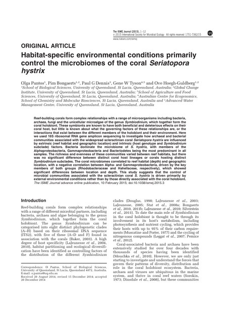 Reef-building corals form complex relationships with a range of microorganisms including bacteria, archaea, fungi and the unicellular microalgae of the genus Symbiodinium, which together form the coral holobiont. These symbionts are known to have both beneficial and deleterious effects on their coral host, but little is known about what the governing factors of these relationships are, or the interactions that exist between the different members of the holobiont and their environment. Here we used 16S ribosomal RNA gene amplicon sequencing to investigate how archaeal and bacterial communities associated with the widespread scleractinian coral Seriatopora hystrix are influenced by extrinsic (reef habitat and geographic location) and intrinsic (host genotype and Symbiodinium subclade) factors. Bacteria dominate the microbiome of S. hystrix, with members of the Alphaproteobacteria, Gammaproteobacteria and Bacteriodetes being the most predominant in all samples. The richness and evenness of these communities varied between reef habitats, but there was no significant difference between distinct coral host lineages or corals hosting distinct Symbiodinium subclades. The coral microbiomes correlated to reef habitat (depth) and geographic location, with a negative correlation between Alpha- and Gammaproteobacteria, driven by the key members of both groups (Rhodobacteraceae and Hahellaceae, respectively), which showed significant differences between location and depth. This study suggests that the control of microbial communities associated with the scleractinian coral S. hystrix is driven primarily by external environmental conditions rather than by those directly associated with the coral holobiont.