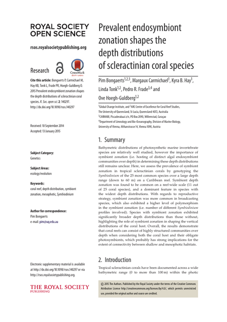 Bathymetric distributions of photosynthetic marine invertebrate species are relatively well studied, however the importance of symbiont zonation (i.e. hosting of distinct algal endosymbiont communities over depth) in determining these depth distributions still remains unclear. Here, we assess the prevalence of symbiont zonation in tropical scleractinian corals by genotyping the Symbiodinium of the 25 most common species over a large depth range (down to 60 m) on a Caribbean reef. Symbiont depth zonation was found to be common on a reef-wide scale (11 outof 25 coral species), and a dominant feature in species with the widest depth distributions. With regards to reproductive strategy, symbiont zonation was more common in broadcasting species, which also exhibited a higher level of polymorphism in the symbiont zonation (i.e. number of different Symbiodinium profiles involved). Species with symbiont zonation exhibited significantly broader depth distributions than those without,highlighting the role of symbiont zonation in shaping the vertical distributions of the coral host. Overall, the results demonstrate that coral reefs can consist of highly structured communities over depth when considering both the coral host and their obligate photosymbionts, which probably has strong implications for the extent of connectivity between shallow and mesophotic habitats.