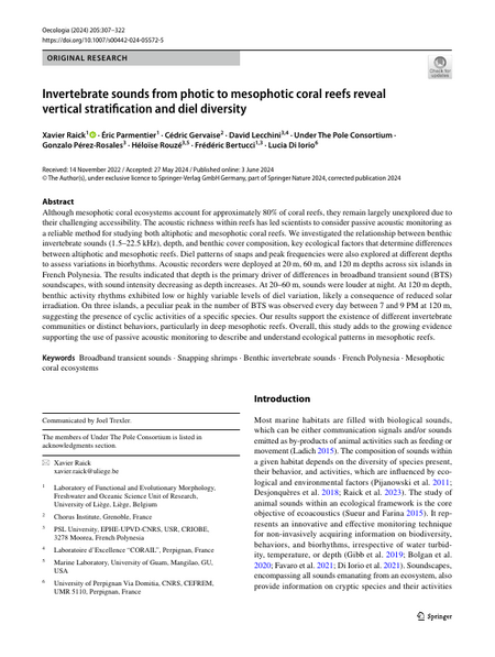 Although mesophotic coral ecosystems account for approximately 80% of coral reefs, they remain largely unexplored due to their challenging accessibility. The acoustic richness within reefs has led scientists to consider passive acoustic monitoring as a reliable method for studying both altiphotic and mesophotic coral reefs. We investigated the relationship between benthic invertebrate sounds (1.5–22.5 kHz), depth, and benthic cover composition, key ecological factors that determine differences between altiphotic and mesophotic reefs. Diel patterns of snaps and peak frequencies were also explored at different depths to assess variations in biorhythms. Acoustic recorders were deployed at 20 m, 60 m, and 120 m depths across six islands in French Polynesia. The results indicated that depth is the primary driver of differences in broadband transient sound (BTS) soundscapes, with sound intensity decreasing as depth increases. At 20–60 m, sounds were louder at night. At 120 m depth, benthic activity rhythms exhibited low or highly variable levels of diel variation, likely a consequence of reduced solar irradiation. On three islands, a peculiar peak in the number of BTS was observed every day between 7 and 9 PM at 120 m, suggesting the presence of cyclic activities of a specific species. Our results support the existence of different invertebrate communities or distinct behaviors, particularly in deep mesophotic reefs. Overall, this study adds to the growing evidence supporting the use of passive acoustic monitoring to describe and understand ecological patterns in mesophotic reefs.