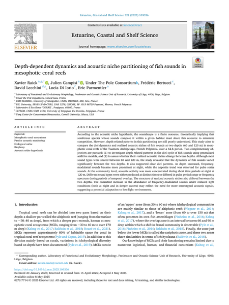 According to the acoustic niche hypothesis, the soundscape is a finite resource, theoretically implying that soniferous species whose sounds compose it within a given habitat must share this resource to minimize competition. However, depth-related patterns in this partitioning are still poorly understood. This study aims to compare the diel dynamics and realized acoustic niches of fish sounds at two depths (60 and 120 m) in mesophotic coral reefs of the Tuamotu Archipelago, French Polynesia, over a 62-h period. Two complementary objectives are pursued: (1) to investigate depth-related patterns in the diel cycle of fish sounds using generalized additive models, and (2) to assess whether their realized acoustic niches change between depths. Although most sound types were shared between 60 and 120 m, the study revealed that the dynamics of fish sounds varied significantly between the two depths. It also supported clear diel patterns. As depth increased, frequency-modulated sounds became more prominent at night, while the opposite trend was observed for pulse series sounds. At the community level, acoustic activity was more concentrated during short time periods at night at 120 m. Different sound types were either produced at distinct times or differed in pulse period range or frequency spectrum during periods of temporal overlap. The structure of realized acoustic niches also differed between the two depths. The consistent increase in the abundance of frequency-modulated sounds under reduced light conditions (both at night and in deeper waters) may reflect the need for more stereotyped acoustic signals, suggesting a potential adaptation to low-light environments.