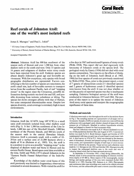 Johnston Atoll lies 800 km southwest of the nearest reefs of Hawaii and over 1,500 km from other shallow reefs to the south and west. Only 33 species and 16 genera and subgenera of shallow water stony corals have been reported from the atoll. Endemic species are absent despite Johnston's great age and favorable environment. With few exceptions, only species with broad geographic distribution are represented. Factors contributing to the low number of species are remoteness, the atoll's small size, lack of favorable currents to transport larvae from the southwest Pacific, lack of reef “stepping stones” in the region since the Cretaceous, possible defaunation during eustatic sea-level rise and fall, and possible drowning from tectonic subsidence or tilting. The species list shows strongest affinity with that of Hawaii, but some unexpected discontinuities occur. Despite low species diversity, coral coverage is extremely high in most environments.