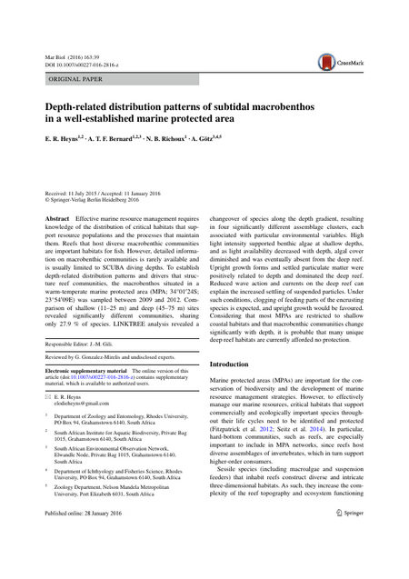 Effective marine resource management requires knowledge of the distribution of critical habitats that support resource populations and the processes that maintain them. Reefs that host diverse macrobenthic communities are important habitats for fish. However, detailed information on macrobenthic communities is rarely available and is usually limited to SCUBA diving depths. To establish depth-related distribution patterns and drivers that structure reef communities, the macrobenthos situated in a warm-temperate marine protected area (MPA; 34°01′24S; 23°54′09E) was sampled between 2009 and 2012. Comparison of shallow (11–25 m) and deep (45–75 m) sites revealed significantly different communities, sharing only 27.9 % of species. LINKTREE analysis revealed a changeover of species along the depth gradient, resulting in four significantly different assemblage clusters, each associated with particular environmental variables. High light intensity supported benthic algae at shallow depths, and as light availability decreased with depth, algal cover diminished and was eventually absent from the deep reef. Upright growth forms and settled particulate matter were positively related to depth and dominated the deep reef. Reduced wave action and currents on the deep reef can explain the increased settling of suspended particles. Under such conditions, clogging of feeding parts of the encrusting species is expected, and upright growth would be favoured. Considering that most MPAs are restricted to shallow coastal habitats and that macrobenthic communities change significantly with depth, it is probable that many unique deep reef habitats are currently afforded no protection.