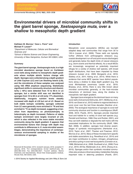 The giant barrel sponge, Xestospongia muta, is a high microbial abundance sponge found on Caribbean coral reefs along shallow to mesophotic depth gradients where multiple abiotic factors change with depth. Sponges were collected along a depth gradient at Little Cayman (LC) and Lee Stocking Island (LSI) and the microbiome of these samples was analyzed using 16S rRNA amplicon sequencing. Statistically significant shifts in community structure and dissimilarity (∼40%) were detected from 10 to 90 m in LC sponges, but a similar shift was not identified in sponges from 10-60 m at LSI (only 17% dissimilar). Additionally, inorganic nutrient levels steadily increased with depth at LSI but not at LC. Based on bulk stable isotopic variability, sponges collected from LC were generally more enriched in 15N and less enriched in 13C as depth increased, suggesting a transition from dependency on photoautotrophy to heterotrophy as depth increased. Patterns of stable isotopic enrichment were largely invariant at LSI, which is also reflected in the more stable microbial community along the depth gradient. It appears that environmental factors that change with depth may contribute to differences in X. muta microbial assemblages, demonstrating the importance of contemporaneous environmental sampling in studies of the microbiome of sponges.