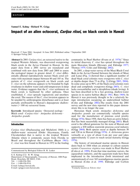 In 2001 Carijoa riisei, an octocoral native to the tropical Western Atlantic, was discovered overgrowing black corals in the Au’au Channel in Hawaii. In this paper data from a 2001 survey are reanalyzed and combined with new data from 2003 and 2004 to assess the ecological impact in greater detail. C. riisei differentially affected reproductively mature black coral colonies with maximum impact between 80 and 105 m. The pattern of C. riisei over growth on black corals and C. riisei on the substrata appears to be bounded by high irradiance in shallow water and cold temperature in deep water. Evidence suggests that the C. riisei settlement on black corals is facilitated by other epifauna. Once established, C. riisei spreads vegetatively and smothers the coral. The success of the C. riisei invasion appears to be unaided by anthropogenic disturbance and is at least partially attributable to Hawaii’s depauperate shallow-water (<100 m) octocoral fauna.