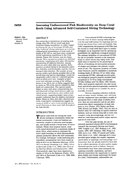 Due primarily to limitations of existing technology, deep (60‐150 m) coral reefs have remained largely unexplored. In 1989 I began developing the use of mixed-gas SCUBA and other ‘technical’ diving techniques as a tool for ichthyological investigation of coral reefs at depths of 60‐150 m, and have since conducted initial exploratory expeditions to the Cook Islands, Papua New Guinea, and the Patau Islands. These expeditions yielded over 200 fish specimens, comprising more than 100 species representing 20 different families. Among these are more than fifty new species, three-quarters of which belong to the families Labridae, Gobiidae, and Serranidae, and the rest are among 9 other families. The number of new species within each family parallels that of the overall deep-reef species assemblage, except for Apogonidae with a total of 7 collected species, none of which were new. Analysis of specimens and videotape surveys of the ichthyofauna at one 90-m site in Patau suggests that as many as 70% of the species inhabiting this depth are undescribed. New species assemblages on deep reefs show comparatively low distributional overlap (both between different island groups, and between sites within each island group), suggesting higher rates of geographic endemism than for shallow-reef assemblages. Based on these and other observed patterns, conservative extrapolations suggest as many as 2,000 or more coral-reef fish species await discovery on deep coral reefs throughout the Indo-Pacific.