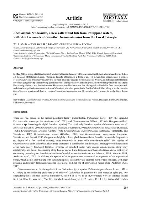 In May 2014, a group of ichthyologists from the California Academy of Sciences and the Bishop Museum collecting fishes off the coast of Batangas, Luzon, Philippine Islands, obtained, in a depth of ca. 150 meters, four specimens of a species of Grammatonotus previously unknown to science. This new species, Grammatonotus brianne, is distinguishable from its described congeners by the following combination of characters: short anal-fin spines, rhomboid shaped caudal fin, lateral line usually disjunct, and live coloration. Herein we provide characters that distinguish callanthiids from other percoids and that distinguish Grammatonotus from Callanthias, the other genus in the family Callanthiidae, along with the description of the new species and short accounts of two other Grammatonotus, G. crosnieri and G. roseus, from the Coral Triangle.