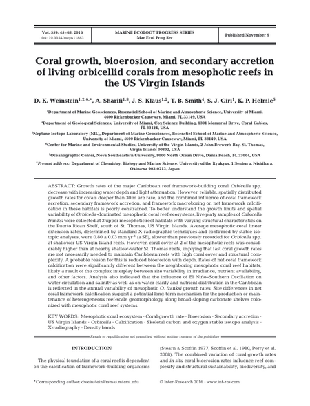 Growth rates of the major Caribbean reef framework building coral Orbicella spp. decrease with increasing water depth and light attenuation. However, reliable, spatially distributed growth rates for corals deeper than 30 m are rare, and the combined influence of coral framework accretion, secondary framework accretion, and framework macroboring on net framework calcification in these habitats is poorly constrained. To better understand the growth limits and spatial variability of Orbicella-dominated mesophotic coral reef ecosystems, live platy samples of Orbicella franksi were collected at 3 south Puerto Rican Shelf upper mesophotic reef habitats with varying structural characteristics. Average mesophotic coral linear extension rates, determined by standard X-radiographic techniques and confirmed by stable isotopic analyses, were 0.80 mm/yr ± 0.03 SE, slower than previously recorded for Orbicella spp. at shallower U. S. Virgin Island reefs. However, coral cover at 2 of the mesophotic reefs was considerably higher than at nearby shallow-water reefs, implying that fast coral growth rates are not necessarily needed to maintain Caribbean reefs with high coral cover and structural complexity. A probable reason for this is reduced bioerosion with depth. Rates of net coral framework calcification were significantly different between the neighboring mesophotic coral reef habitats, likely a result of the complex interplay between site variability in irradiance, nutrient availability, and other factors. Analysis also indicated that the influence of El Niño–Southern Oscillation on water circulation and salinity as well as on water clarity and nutrient distribution in the Caribbean is reflected in the annual variability of mesophotic O. franksi growth rates. Site differences in net coral framework calcification suggest a potential long-term mechanism for the production or maintenance of heterogeneous reef-scale geomorphology along broad-sloping carbonate shelves colonized with mesophotic coral reef systems.