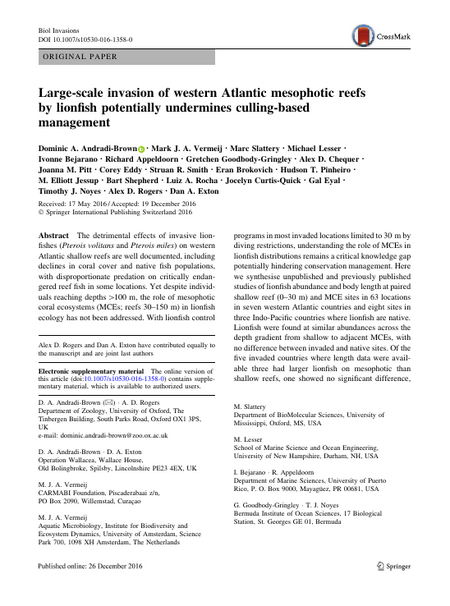 The detrimental effects of invasive lionfishes (Pterois volitans and Pterois miles) on western Atlantic shallow reefs are well documented, including declines in coral cover and native fish populations, with disproportionate predation on critically endangered reef fish in some locations. Yet despite individuals reaching depths[100 m, the role of mesophotic coral ecosystems (MCEs; reefs 30–150 m) in lionfish ecology has not been addressed. With lionfish control programs in most invaded locations limited to 30 mby diving restrictions, understanding the role of MCEs in lionfish distributions remains a critical knowledge gap potentially hindering conservation management. Here we synthesise unpublished and previously published studies of lionfish abundance and body length at paired shallow reef (0–30 m) and MCE sites in 63 locations in seven western Atlantic countries and eight sites in three Indo-Pacific countries where lionfish are native. Lionfish were found at similar abundances across the depth gradient from shallow to adjacent MCEs, with no difference between invaded and native sites. Of the five invaded countries where length data were available three had larger lionfish on mesophotic than shallow reefs, one showed no significant difference, while the fifth represented a recently invaded site. This suggests at least some mesophotic populations may represent extensions of natural ontogenetic migrations. Interestingly, despite their shallow focus, in many cases culling programs did not appear to alter abundance between depths. In general, we identify widespread invasive lionfish populations on MCE that could be responsible for maintaining high densities of lionfish recruits despite local shallow-biased control programs. This study highlights the need for management plans to incorporate lionfish populations below the depth limit of recreational diving in order to address all aspects of the local population and maximise the effectiveness of control efforts.