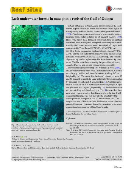 The Gulf of Guinea, in West Africa, harbors some of the least known tropical reefs in the world. Shallow reefs in this region are mainly rocky and have limited scleractinian growth (Laborel 1974). Circulation patterns restrict warm waters to the surface layer and cooler waters to below 20–30 m depth (Laborel 1974). Reefs lying below these depths, in cool water, have not yet been described. Here, we report a mesophotic reef ecosystem dominated by black corals between 30 and 50 m depth off Lagoa Azul, northwest São Tomé Island (0°24′33″N, 6°36′30″E). At 28–30 m depth, temperature declined abruptly, from 29 °C to 22 °C, and the reef shifted from rocky/biogenic patches (scleractinians Montastrea cavernosa, Siderastrea sp., and coralline algae) among sand to high-canopy black corals on rocky substrate. The black corals were mainly the greenish Antipathes gracilis (Fig. 1a) and a white-colored species, possibly Tanacetipathes spinescens (Fig. 1b; Wirtz and d’Acoz 2008), and also included the whip coral Stichopathes lutkeni. Colonies were largely ramified and formed canopies reaching 1–2 m height (Fig. 1c). The dense distribution of colonies between 35 and 50 m depth resembled a large underwater forest, intensified by the green coloration of A. gracilis (Fig. 1d). Canopies gave shelter to schools of fish, especially Paranthias furcifer, Clepticus africanus, and Lutjanus fulgens (Fig. 1e). In situ observation of canoes fishing and abandoned gear (Fig. 1f), as well as fishermen interviews, revealed that this area is heavily fished with occasional blasting. This reef may also be affected by the development of a deepwater port ~7 km from the area. The fragile structure of black corals in this hitherto undescribed and potentially unique ecosystem should be considered in the management and conservation of São Tomé’s reefs.