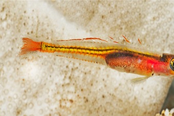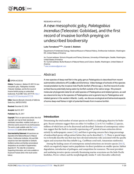 A new species of deep-reef fish in the goby genus Palatogobius is described from recent submersible collections off Curaçao and Dominica. Video footage of schools of this species reveal predation by the invasive Indo-Pacific lionfish (Pterois spp.), the first record of undescribed fauna potentially being eaten by lionfish outside of its native range. We present molecular phylogenetic data for all valid species of Palatogobius and related genera, as well as a taxonomic key to the species of Palatogobius and a generic key to Palatogobius and related genera in the western Atlantic. Lastly, we discuss ecological and behavioral aspects of some deep-reef fishes in light of potential threats from invasive lionfish.