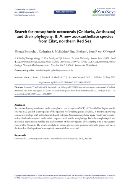 An octocoral survey conducted in the mesophotic coral ecosystem (MCE) of Eilat (Gulf of Aqaba, northern Red Sea) yielded a new species of the speciose reef-dwelling genus Sinularia. It features encrusting colony morphology with a thin, funnel-shaped polypary. Sinularia mesophotica sp. n. (family Alcyoniidae) is described and compared to the other congeners with similar morphology. Both the morphological and molecular examination justified the establishment of the new species, also assigning it to a new genetic clade within Sinularia. The results highlight its unique phylogenetic position within the genus, and this is the first described species of a mesophotic zooxanthellate octocoral.