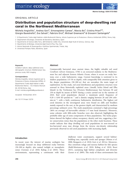 Commercially harvested since ancient times, the highly valuable red coral Corallium rubrum (Linnaeus, 1758) is an octocoral endemic to the Mediterranean Sea and adjacent Eastern Atlantic Ocean, where it occurs on rocky bottoms over a wide bathymetric range. Current knowledge is restricted to its shallow populations (15–50 m depth), with comparably little attention given to the deeper populations (50–200 m) that are nowadays the main target of exploitation. In this study, red coral distribution and population structure were assessed in three historically exploited areas (Amalfi, Ischia Island and Elba Island) in the Tyrrhenian Sea (Western Mediterranean Sea) between 50 and 130 m depth by means of ROV during a cruise carried out in the summer of 2010. Red coral populations showed a maximum patch frequency of 0.20 ± 0.04 SD patches m-1 and a density ranging between 28 and 204 colonies m-2, with a fairly continuous bathymetric distribution. The highest red coral densities in the investigated areas were found on cliffs and boulders mainly exposed to the east, at the greatest depth, and characterized by medium percentage sediment cover. The study populations contained a high percentage (46% on average) of harvestable colonies (>7 mm basal diameter). Moreover, some colonies with fifth-order branches were also observed, highlighting the probable older age of some components of these populations. The Ischia population showed the highest colony occupancy, density and size, suggesting a better conservation status than the populations at the other study locations. These results indicate that deep dwelling red coral populations in non-stressed or less-harvested areas may diverge from the inverse size-density relationship previously observed in red coral populations with increasing depth.