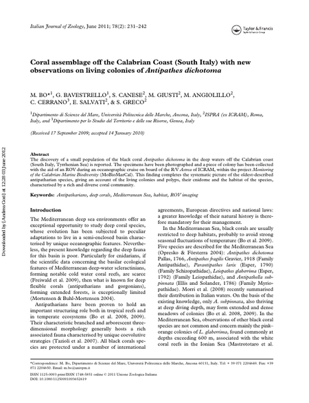 The discovery of a small population of the black coral Antipathes dichotoma in the deep waters off the Calabrian coast (South Italy, Tyrrhenian Sea) is reported. The specimens have been photographed and a piece of colony has been collected with the aid of an ROV during an oceanographic cruise on board of the R/V Astrea of ICRAM, within the project Monitoring of the Calabrian Marine Biodiversity (MoBioMarCal). This finding completes the systematic picture of the oldest-described antipatharian species, giving an account of the living colonies and polyps, their cnidome and the habitat of the species, characterised by a rich and diverse coral community.