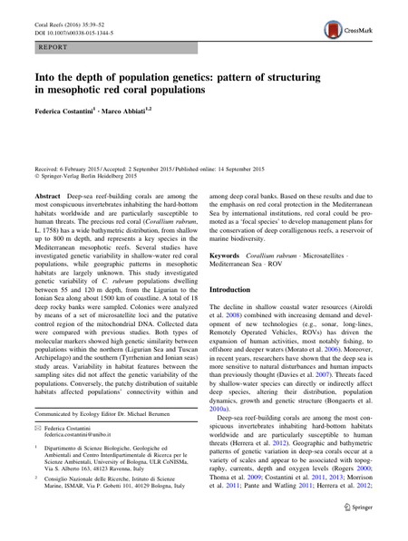 Deep-sea reef-building corals are among the most conspicuous invertebrates inhabiting the hard-bottom habitats worldwide and are particularly susceptible to human threats. The precious red coral (Corallium rubrum, L. 1758) has a wide bathymetric distribution, from shallow up to 800 m depth, and represents a key species in the Mediterranean mesophotic reefs. Several studies have investigated genetic variability in shallow-water red coral populations, while geographic patterns in mesophotic habitats are largely unknown. This study investigated genetic variability of C. rubrum populations dwelling between 55 and 120 m depth, from the Ligurian to the Ionian Sea along about 1500 km of coastline. A total of 18 deep rocky banks were sampled. Colonies were analyzed by means of a set of microsatellite loci and the putative control region of the mitochondrial DNA. Collected data were compared with previous studies. Both types of molecular markers showed high genetic similarity between populations within the northern (Ligurian Sea and Tuscan Archipelago) and the southern (Tyrrhenian and Ionian seas) study areas. Variability in habitat features between the sampling sites did not affect the genetic variability of the populations. Conversely, the patchy distribution of suitable habitats affected populations’ connectivity within and among deep coral banks. Based on these results and due to the emphasis on red coral protection in the Mediterranean Sea by international institutions, red coral could be promoted as a ‘focal species’ to develop management plans for the conservation of deep coralligenous reefs, a reservoir of marine biodiversity.