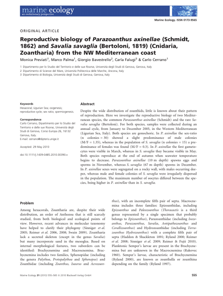 Despite the wide distribution of zoanthids, little is known about their pattern of reproduction. Here we investigate the reproductive biology of two Mediterranean species, the common Parazoanthus axinellae (Schmidt) and the rare Savalia savaglia (Bertoloni). For both species, samples were collected during an annual cycle, from January to December 2005, in the Western Mediterranean (Ligurian Sea, Italy). Both species are gonochoric. In P. axinellae the sex-ratio (n colonies = 30) showed a slight predominance of male colonies (M ⁄ F = 1.35), whereas in the population of S. savaglia (n colonies = 15) a predominance of females was found (M ⁄ F = 0.3). In P. axinellae the first gametocytes were visible in March, whereas in S. savaglia they became visible in May. Both species reproduce at the end of autumn when seawater temperature begins to decrease. Parazoanthus axinellae (10 m depth) spawns eggs and sperms in November, whereas S. savaglia (67 m depth) spawns in December. In P. axinellae sexes were segregated on a rocky wall, with males occurring deeper, whereas male and female colonies of S. savaglia were irregularly dispersed in the population. The maximum number of oocytes differed between the species, being higher in P. axinellae than in S. savaglia.