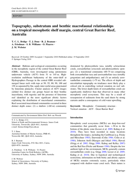 Habitats and ecological communities occurring in the mesophotic region of the central Great Barrier Reef (GBR), Australia, were investigated using autonomous underwater vehicle (AUV) from 51 to 145 m. High-resolution multibeam bathymetry of the outer-shelf at Hydrographers Passage in the central GBR revealed submerged linear reefs with tops at 50, 55, 80, 90, 100 and 130 m separated by flat, sandy inter-reefal areas punctuated by limestone pinnacles. Cluster analysis of AUV images yielded five distinct site groups based on their benthic macrofauna, with rugosity and the presence of limestone reef identified as the most significant abiotic factors explaining the distribution of macrofaunal communities. Reef-associated macrofaunal communities occurred in three distinct depth zones: (1) a shallow (<60 m) community dominated by photosynthetic taxa, notably scleractinian corals, zooxanthellate octocorals and photosynthetic sponges; (2) a transitional community (60–75 m) comprising both zooxanthellate taxa and azooxanthellate taxa (notably gorgonians and antipatharians); and (3) an entirely azooxanthellate community (>75 m). The effects of depth and microhabitat topography on irradiance most likely play a critical role in controlling vertical zonation on reef substrates. The lower depth limits of zooxanthellate corals are significantly shallower than that observed in many other mesophotic coral ecosystems. This may be a result of resuspension of sediments from the sand sheets by strong currents and/or a consequence of cold water upwelling.
