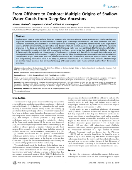 Shallow-water tropical reefs and the deep sea represent the two most diverse marine environments. Understanding the origin and diversification of this biodiversity is a major quest in ecology and evolution. The most prominent and well-supported explanation, articulated since the first explorations of the deep sea, holds that benthic marine fauna originated in shallow, onshore environments, and diversified into deeper waters. In contrast, evidence that groups of marine organisms originated in the deep sea is limited, and the possibility that deep-water taxa have contributed to the formation of shallow-water communities remains untested with phylogenetic methods. Here we show that stylasterid corals (Cnidaria: Hydrozoa: Stylasteridae)—the second most diverse group of hard corals—originated and diversified extensively in the deep sea, and subsequently invaded shallow waters. Our phylogenetic results show that deep-water stylasterid corals have invaded the shallow-water tropics three times, with one additional invasion of the shallow-water temperate zone. Our results also show that anti-predatory innovations arose in the deep sea, but were not involved in the shallow-water invasions. These findings are the first robust evidence that an important group of tropical shallow-water marine animals evolved from deep-water ancestors.