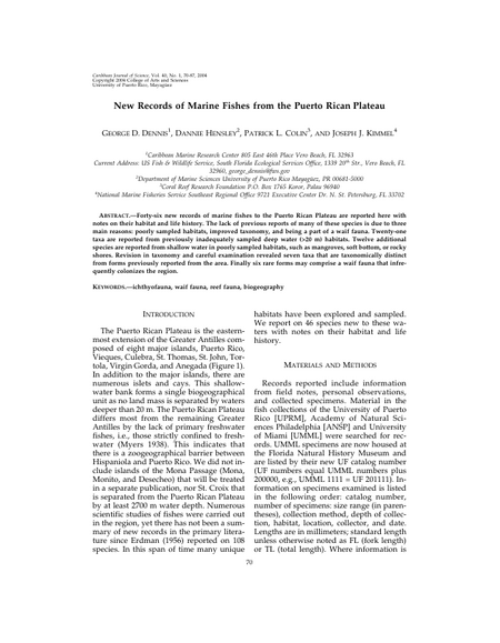 Forty-six new records of marine fishes to the Puerto Rican Plateau are reported here with notes on their habitat and life history. The lack of previous reports of many of these species is due to three main reasons: poorly sampled habitats, improved taxonomy, and being a part of a waif fauna. Twenty-one taxa are reported from previously inadequately sampled deep water (>20 m) habitats. Twelve additional species are reported from shallow water in poorly sampled habitats, such as mangroves, soft bottom, or rocky shores. Revision in taxonomy and careful examination revealed seven taxa that are taxonomically distinct from forms previously reported from the area. Finally six rare forms may compromise a waif fauna that infrequently colonizes the region.