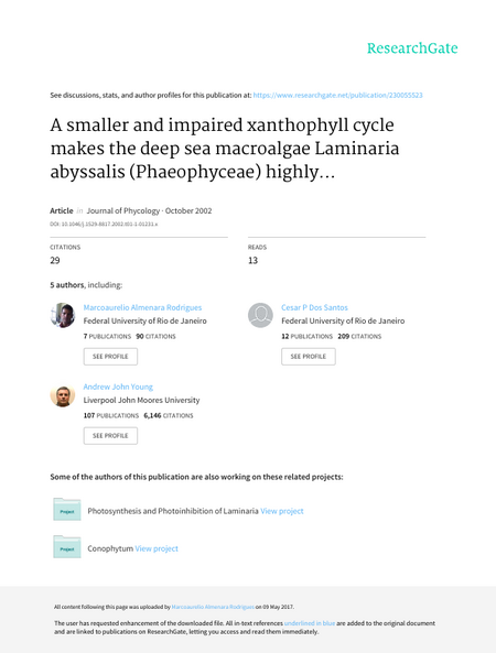 Pigment composition, fluorescence parameters, and oxygen evolution of the deep water Laminaria abyssalis Oliveira and of the shallow water L. digitata Lamoroux were determined in response to high irradiances. This was performed in the presence and absence of an inhibitor of violaxanthin de-epoxidase (dithiothreitol) or an inhibitor of the chloroplast-encoded protein synthesis (chloramphenicol). Photochemical quenching in L. digitata was almost 3-fold that seen in L. abyssalis, whereas both nonphotochemical quenching and PSII photochemical yield were doubled. Laminaria digitata possessed a xanthophyll-cycle pool nearly double that of L. abyssalis. After photoinhibitory treatment, L. digitata displayed substantial violaxanthin de-epoxidation, whereas in L. abyssalis de-epoxidation only took place in limited amounts. Both species were able to fully recover their epoxidation status after transfer back to dim light. Overnight incubation with dithiothreitol fully blocked de-epoxidation in both species, and both displayed similar fluorescence properties. Chloramphenicol caused no change in their fluorescence parameters. With high light treatment, L. abyssalis was completely and irreversibly inhibited both in the presence and absence of inhibitors, whereas L. digitata showed 60% inhibition of its photosynthetic activity and full recovery in the absence of inhibitors. In the presence of dithiothreitol, L. digitata did not recover to the preillumination conditions and chloramphenicol delayed the recovery of the oxygen evolution activity. We suggest that the xanthophyll cycle is the main mechanism of photoprotection of these Laminaria species and that the higher susceptibility of L. abyssalis to photoinhibition may be due to its limited de-epoxidation capacity and reduced xanthophyll-cycle pool size.