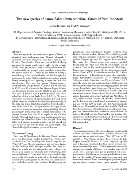 Two new species in the pomacentrid genus Chromis are described from Indonesian seas. Chromis albicauda is described from nine specimens, 79.6-133.7 mm SL, collected at Nusa Penida, off the east coast of Bali. It closely resembles C. analis, which ranges widely in the western Pacific. Both species have a similar yellow colouration, but C. albicauda has an abruptly white caudal fin compared to the yellow caudal of C. analis. It also differs in having a more densely scaled preorbital and a suborbital margin that is obscured by scales. Additional differences include a black blotch covering the anal opening, a larger size, and taller dorsal spines. The other new species, Chromis unipa, is described from five specimens, 42.8-50.4 mm SL collected in 45-60 m in Cenderawasih Bay, Western Papua, Indonesia. Diagnostic features include XIV,11 dorsal rays; II,11 anal rays; 18 pectoral rays; 3 spiniform caudal rays; 14-17 tubed lateral-line scales; body depth 2.0-2.2 in SL, and a distinctive colouration of alternating blue-grey and brassy yellow stripes on the side of the body, blue-grey ventrally on the head and body, bluish fins except for brown basal portion of the caudal fin, and a prominent black spot on the anal fin. It belongs to a complex of deep-dwelling Chromis possessing 14 dorsal spines and it appears most similar to C. degruyi, known from 85-120 m depths in the Caroline Islands. Although both species have similar counts for pectoral-fin rays, tubed lateral-line scales, and gill rakers, they differ with respect to modal numbers of soft dorsal and anal-fin rays as well as body depth and snout length. They also exhibit significant colour pattern differences.