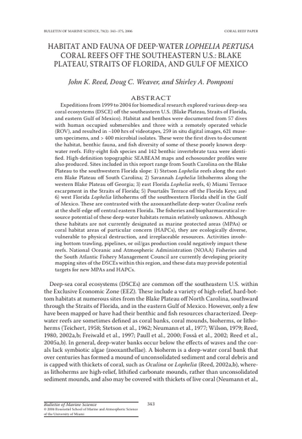 Expeditions from 1999 to 2004 for biomedical research explored various deep-sea coral ecosystems (DSCE) off the southeastern U.S. (Blake Plateau, Straits of Florida, and eastern Gulf of Mexico). Habitat and benthos were documented from 57 dives with human occupied submersibles and three with a remotely operated vehicle (ROV), and resulted in ~100 hrs of videotapes, 259 in situ digital images, 621 museum specimens, and > 400 microbial isolates. These were the first dives to document the habitat, benthic fauna, and fish diversity of some of these poorly known deepwater reefs. Fifty-eight fish species and 142 benthic invertebrate taxa were identified. High-definition topographic SEABEAM maps and echosounder profiles were also produced. Sites included in this report range from South Carolina on the Blake Plateau to the southwestern Florida slope: 1) Stetson Lophelia reefs along the eastern Blake Plateau off South Carolina; 2) Savannah Lophelia lithoherms along the western Blake Plateau off Georgia; 3) east Florida Lophelia reefs, 4) Miami Terrace escarpment in the Straits of Florida; 5) Pourtalès Terrace off the Florida Keys; and 6) west Florida Lophelia lithoherms off the southwestern Florida shelf in the Gulf of Mexico. These are contrasted with the azooxanthellate deep-water Oculina reefs at the shelf-edge off central eastern Florida. The fisheries and biopharmaceutical resource potential of these deep-water habitats remain relatively unknown. Although these habitats are not currently designated as marine protected areas (MPAs) or coral habitat areas of particular concern (HAPCs), they are ecologically diverse, vulnerable to physical destruction, and irreplaceable resources. Activities involving bottom trawling, pipelines, or oil/gas production could negatively impact these reefs. National Oceanic and Atmospheric Administration (NOAA) Fisheries and the South Atlantic Fishery Management Council are currently developing priority mapping sites of the DSCEs within this region, and these data may provide potential targets for new MPAs and HAPCs.