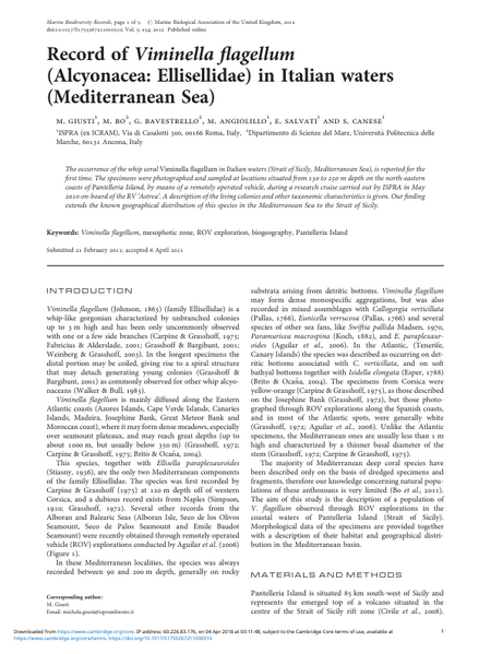 The occurrence of the whip coral Viminella flagellum in Italian waters (Strait of Sicily, Mediterranean Sea), is reported for the first time. The specimens were photographed and sampled at locations situated from 130 to 250 m depth on the north-eastern coasts of Pantelleria Island, by means of a remotely operated vehicle, during a research cruise carried out by ISPRA in May 2010 on-board of the RV ‘Astrea’. A description of the living colonies and other taxonomic characteristics is given. Our finding extends the known geographical distribution of this species in the Mediterranean Sea to the Strait of Sicily.